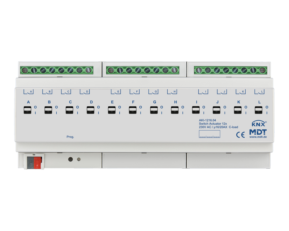 KNX stikalni aktuator, 12-kanalni, 12 SU MDRC, 16/20 A, 230 V AC, C-obremenitev, industrija, 200 ?F. Industrijska izvedba z bistabilnimi releji, maks. tok 16/20 A, kapacitivna obremenitev 200 µF. Celovita uporaba. Mehansko ročno aktiviranje za takojšnje delovanje relejnega kontakta. Vidno stanje. Normalno odprt in normalno zaprt. Časovne funkcije (zakasnitev vklopa/izklopa). Celovite funkcije osvetlitve stopnišča in impulzov. Razširjena logika in funkcija scene na kanal. Razširjene funkcije stanja (obrnjeno, ciklično, med zaklepanjem). Pragovno stikalo (1 bajt/2 bajta/2 bajta s plavajočo napetostjo). Števec obratovalnih ur. Prednostno/prisilno delovanje z avtomatskim časom sprostitve. 4 mm? priključne sponke. Posamezne L-priključki. Napajanje prek vodila KNX. Hiter prenos aplikacije (podpora za dolge okvirje od ETS 5). 3-letna garancija. PODATKOVNI LIST