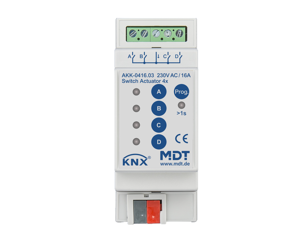 KNX stikalni aktuator, 4-kanalni, 2 SU MDRC, 16 A, 230 V AC, kompakten, 70 µF, 10 EVG. Kompaktna izvedba z bistabilnim relejem. Maks. tok 16 A z ohmsko obremenitvijo, 70 µF / 10 EVG. Razširitev funkcij. Tipka za ročno upravljanje in LED indikator na kanal. Normalno odprt in normalno zaprt. Povratno sporočilo o stanju za vse kanale (tudi za ročno upravljanje). Časovne funkcije (zakasnitev vklopa/izklopa). Celovita osvetlitev stopnišča in impulzne funkcije. Povratno sporočilo o stanju za vse kanale (tudi za ročno upravljanje). Logične funkcije. Razširjena funkcija scene na kanal. Centralne funkcije in blokirni objekti za vsiljeno delovanje. Izbira delovanja ob izpadu napajanja vodila/ponastavitvi. Skupni L-priključek. Napajanje prek vodila KNX. Hiter prenos aplikacije (podpora za dolge okvirje od ETS 5). 3-letna garancija. PODATKOVNI LIST