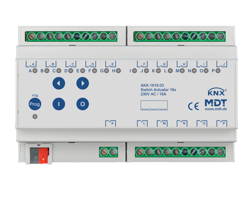 KNX stikalni aktuator, 16-kanalni, 8 SU MDRC, 16 A, 230 V AC, kompakten, 70 µF, 10 EVG. Kompaktna izvedba z bistabilnim relejem. Maks. tok 16 A z ohmsko obremenitvijo, 70 µF / 10 EVG. Razširitev funkcij. Ročni način delovanja z možnostjo blokade in LED indikator na kanal. Normalno odprt in normalno zaprt. Povratna informacija o stanju za vse kanale (tudi za ročno upravljanje). Časovne funkcije (zakasnitev vklopa/izklopa). Celovita osvetlitev stopnišča in impulzne funkcije. Logične funkcije. Razširjena funkcija scene na kanal. Centralne funkcije in blokirni objekti za prisilno delovanje. Izbira delovanja ob izpadu napajanja vodila/ponastavitvi. Priključni priključki 4 mm?. Posamezni L-priključki. Napajanje prek vodila KNX. Hiter prenos aplikacij (podpora za dolge okvirje od ETS 5). 3-letna garancija. PODATKOVNI LIST