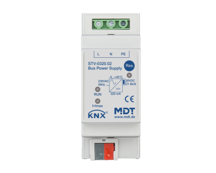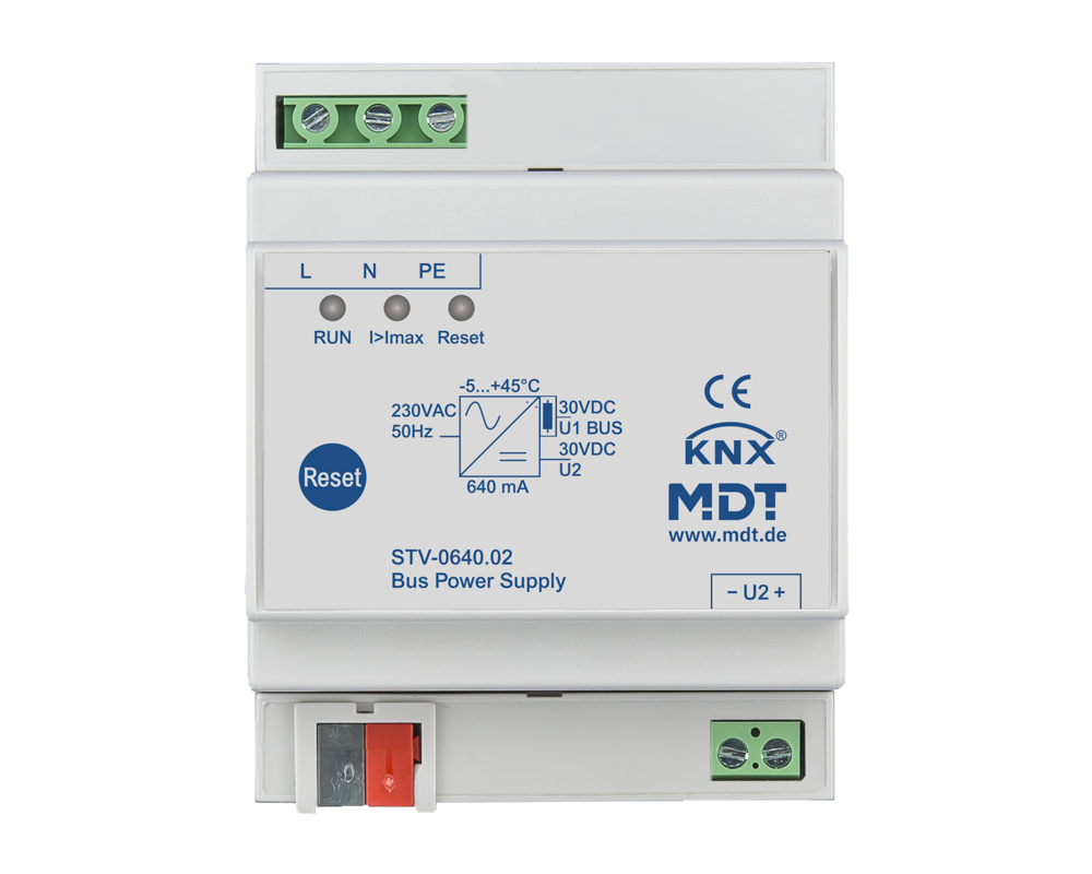 KNX napajalnik vodila, 4 SU MDRC, 640 mA. Izvedba z nazivnim tokom 640 mA. KNX napajalnik vodila z vgrajeno dušilko. Napajanje 230 V AC. Nazivni tok 640 mA, trajni tok 900 mA, najvišji tok 1200 mA. Odporen na kratek stik. Zaščiten pred preobremenitvijo. Nadzor temperature s funkcijo samodejnega izklopa v primeru pregrevanja. LED indikator za ponastavitev vodila KNX, normalno delovanje in preobremenitev. Dodaten oddušen izhod U2. 3-letna garancija. PODATKOVNI LIST